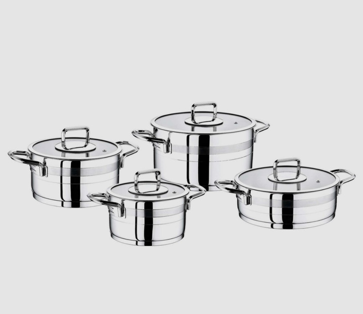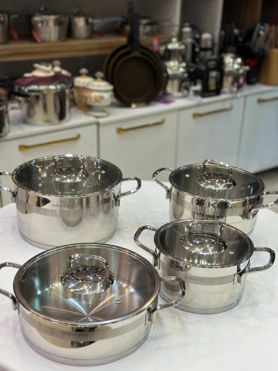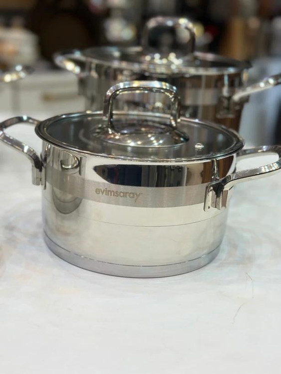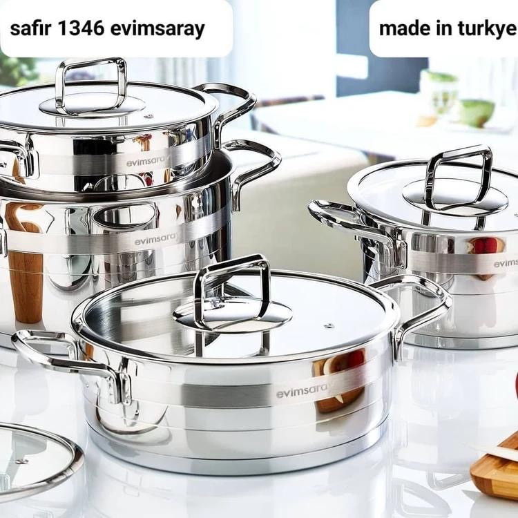 ست ظروف ۸ تکه evimsaray ترکیه ، فولاد ضد زنگ ۱۸/۱۰ (Cr-Ni) ، شکل بدنه ویژه ی پایه سوپر کپسول ارائه دهنده رسانش حرارتی همگن سطوح خارجی که همیشه درخشش خود را حفظ می کنند. دسته ها و رویه های فولادی ضد زنگ و مقاوم در برابر حرارت با درب های شیشه های شفاف و مقاوم در برابر حرارت.