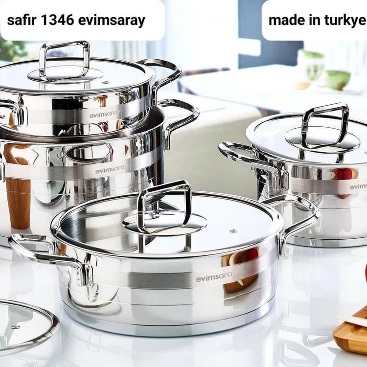 ست ظروف ۸ تکه evimsaray ترکیه ، فولاد ضد زنگ ۱۸/۱۰ (Cr-Ni) ، شکل بدنه ویژه ی پایه سوپر کپسول ارائه دهنده رسانش حرارتی همگن سطوح خارجی که همیشه درخشش خود را حفظ می کنند. دسته ها و رویه های فولادی ضد زنگ و مقاوم در برابر حرارت با درب های شیشه های شفاف و مقاوم در برابر حرارت.
