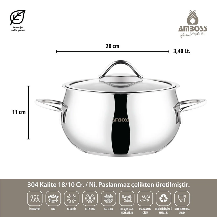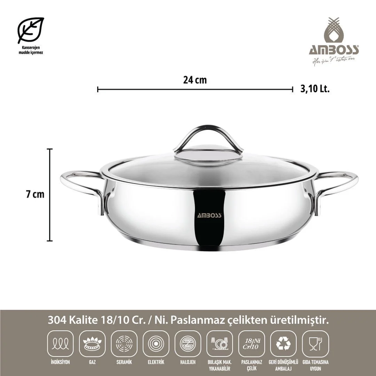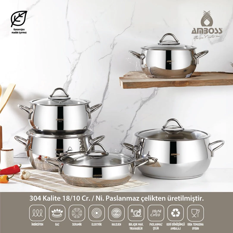 قابلمه ها و تابه ی این سرویس قابلمه آمباس Amboss کاملا نچسپ بوده و همچنین درب های آن از جنس پیرکس آنتی شوک هستند که این سرویس قابلمه را به یکی از بهترین سرویس قابلمه استیل تبدیل کرده است.